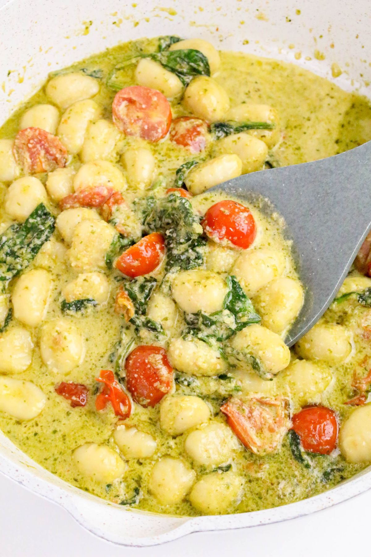 This creamy pesto gnocchi is one of those weeknight dinners that feels a little fancy but is still totally doable on a busy night. Soft gnocchi, a creamy pesto sauce, juicy tomatoes, and fresh spinach all come together in one pan for a comforting meal that won’t leave you feeling weighed down.