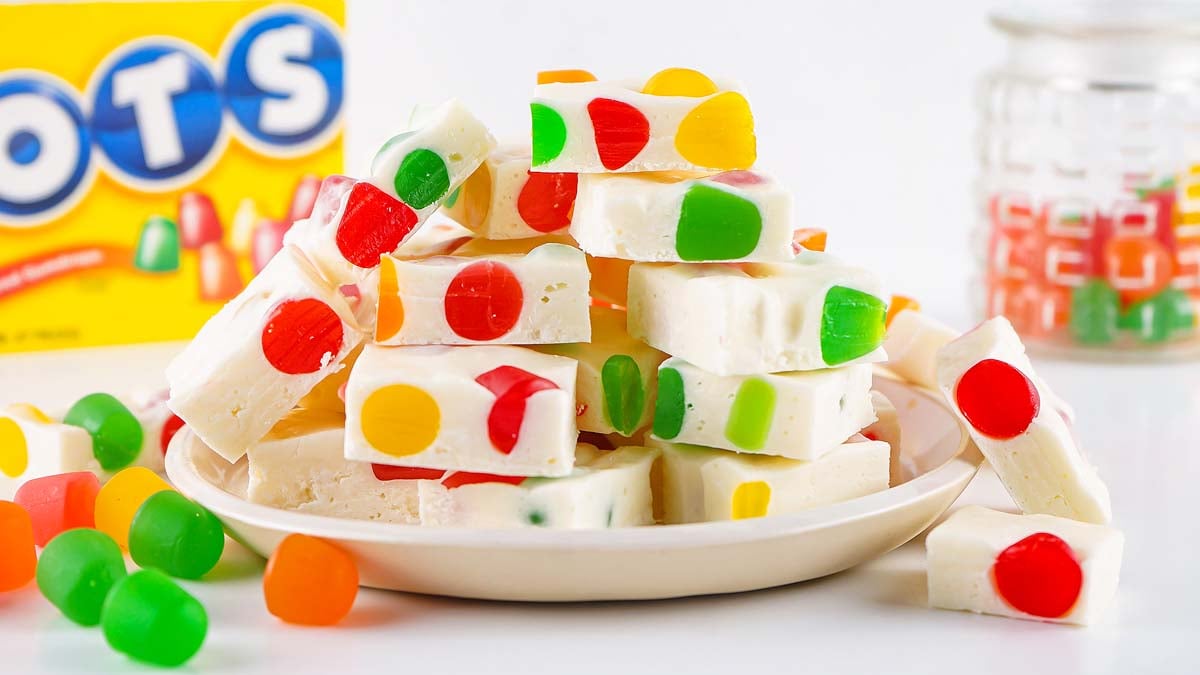 Colorful gumdrops add chewy bursts of flavor to this simple nougat recipeโjust four ingredients and fifteen minutes to festive perfection.