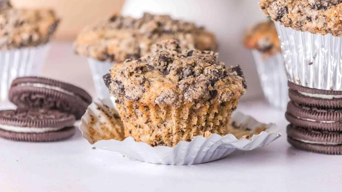 These soft, chocolatey muffins are studded with Oreo pieces and topped with a sweet crumb layer. They are perfect for breakfast or snacking.