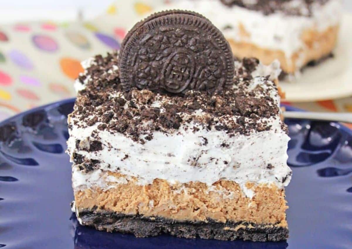 Layers of smooth cheesecake filling rest on a crunchy Oreo crust and are topped with crushed cookies and whipped topping. It is creamy, sweet, and full of texture.