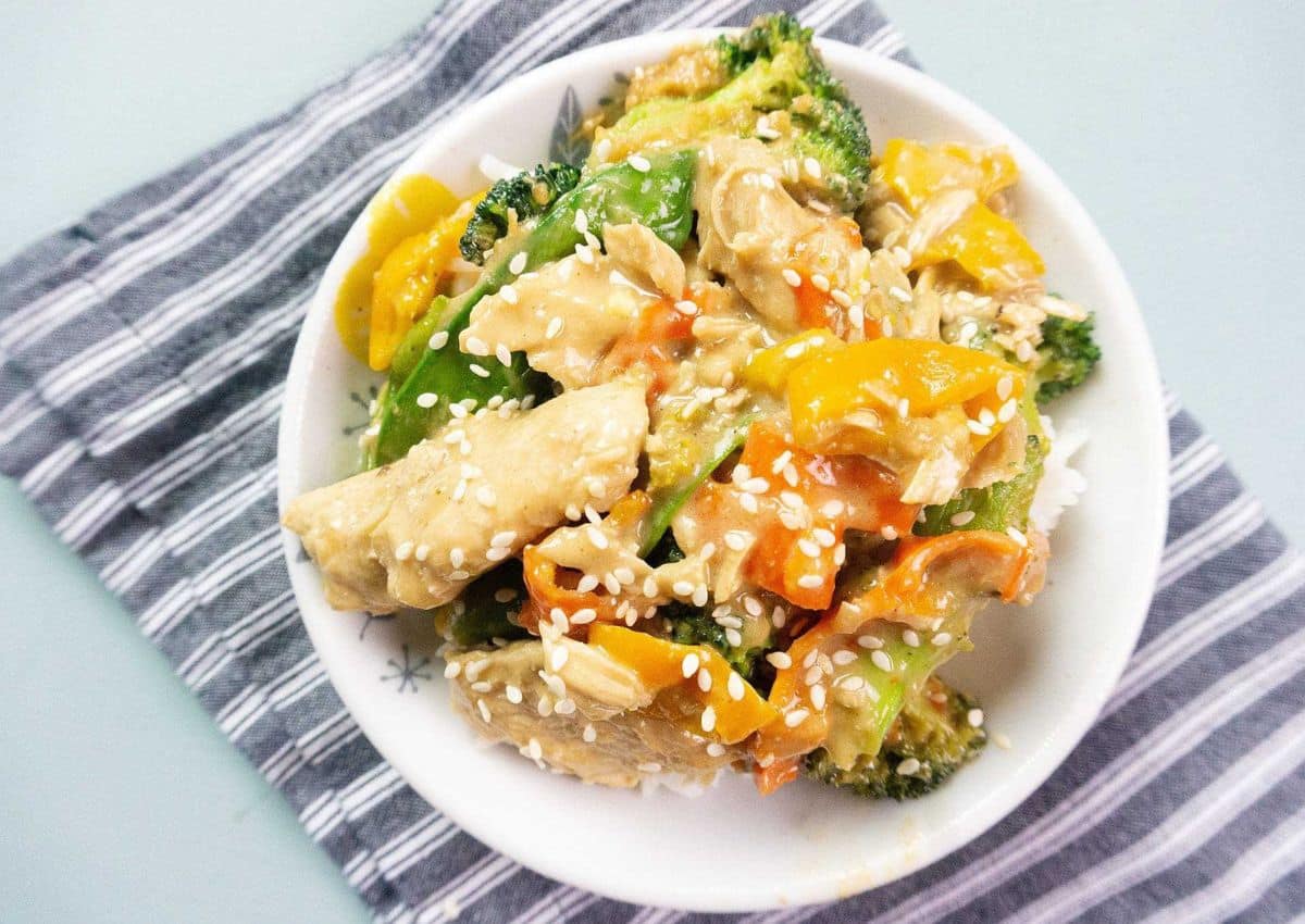 Tender chicken cooks in a sweet and tangy peanut sauce for a quick dinner that comes together in under 30 minutes.