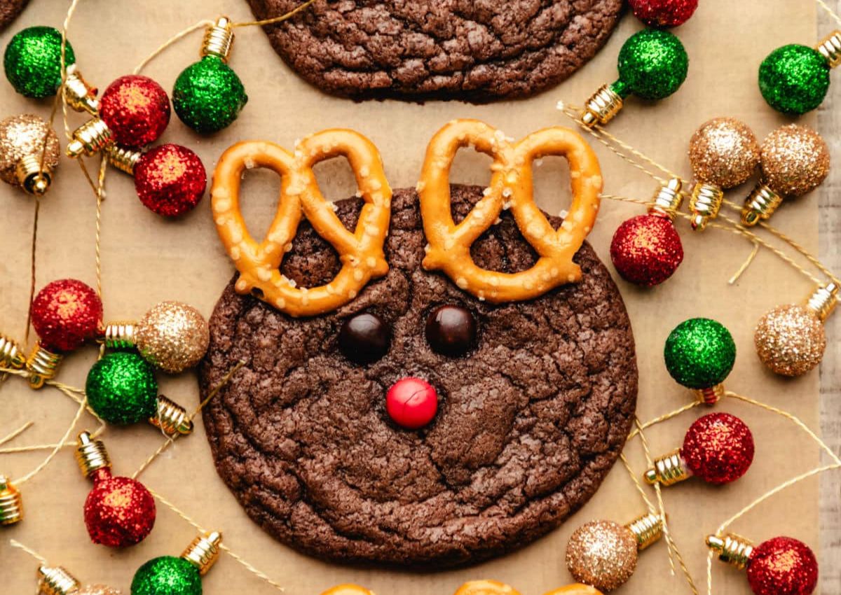 These soft chocolate cookies are one of the easiest Christmas recipes youโll make. No mixer and no chilling required, just simple steps and festive decorations. Candy faces and pretzel antlers turn them into an instant holiday classic.